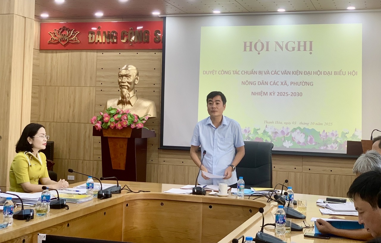 Ngày 03-10, Hội Nông dân (HND) tỉnh Thanh Hóa tổ chức Hội nghị Duyệt công tác chuẩn bị và các văn kiện Đại hội Đại hội đại biểu HND xã, phường nhiệm kỳ 2025–2030 cho HND 25 xã, phường trong tỉnh. Đồng chí Lê Văn Châu, Uỷ viên Ban Chấp hành Đảng bộ tỉnh, Phó Chủ tịch Ủy ban Mặt trận Tổ quốc Việt Nam tỉnh, Bí thư Đoàn Thanh niên Cộng sản Hồ Chí Minh chủ trì Hội nghị. Tham dự có các đồng chí Uỷ viên Ban Thường vụ, Ban Chấp hành HND tỉnh; đại diện Thường trực Đảng ủy, Ủy ban Mặt trận Tổ quốc Việt Nam xã; Chủ tịch, Phó Chủ tịch HND các xã, phường liên quan và các đồng chí trong tổ công tác.